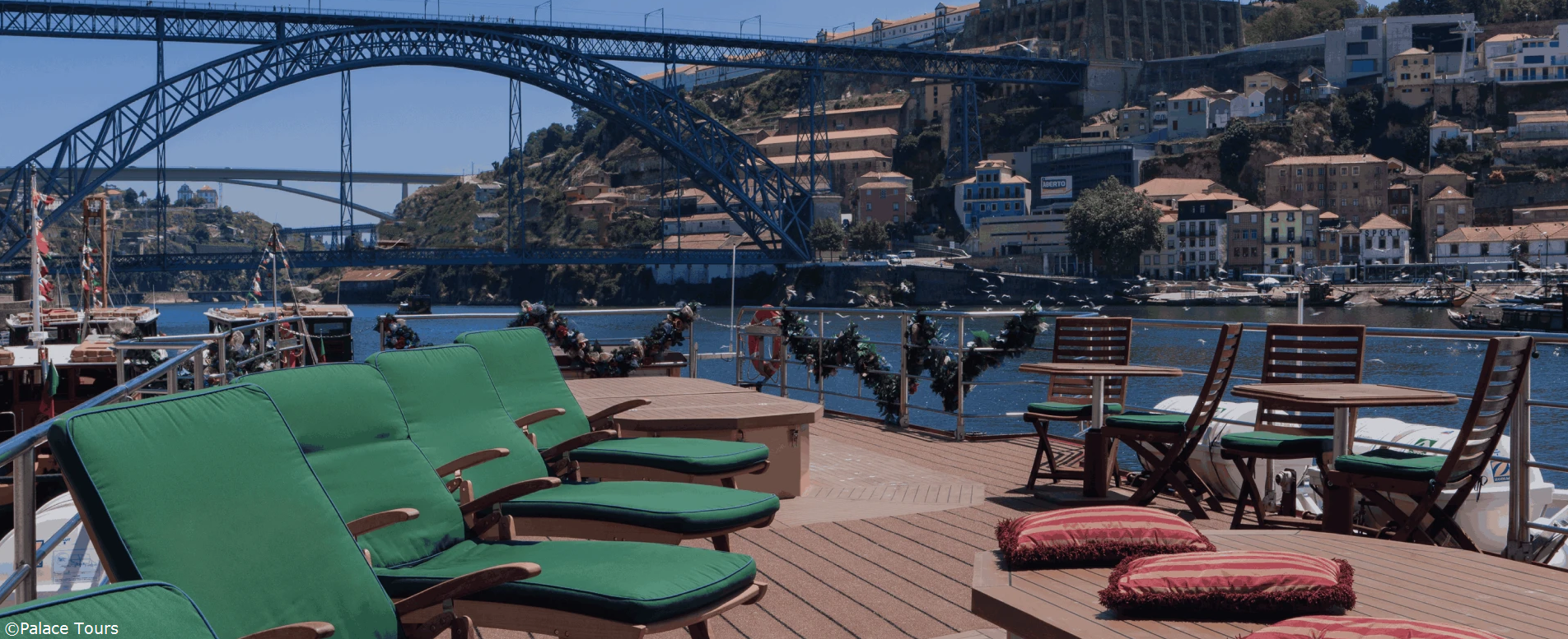 Once settled into your cabin, which features the finest wood finishes and classic Pullman-style decor, you are invited to the sun deck or the panoramic lounge for a Welcome Cocktail. This is your first opportunity to meet the Captain and the dedicated crew who will ensure your comfort throughout the weekend. As the sun begins to set, casting a golden glow over the Dom Luís I Bridge and the colorful Ribeira district across the water, the ambiance is one of anticipation and relaxation.